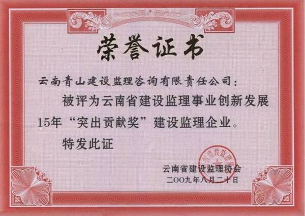 2009年云南省建設(shè)監(jiān)理事業(yè)創(chuàng)新發(fā)展15年“突出貢獻(xiàn)獎(jiǎng)”建設(shè)監(jiān)理企業(yè)