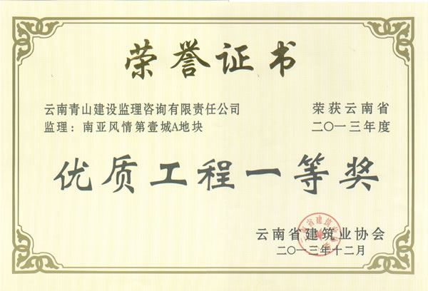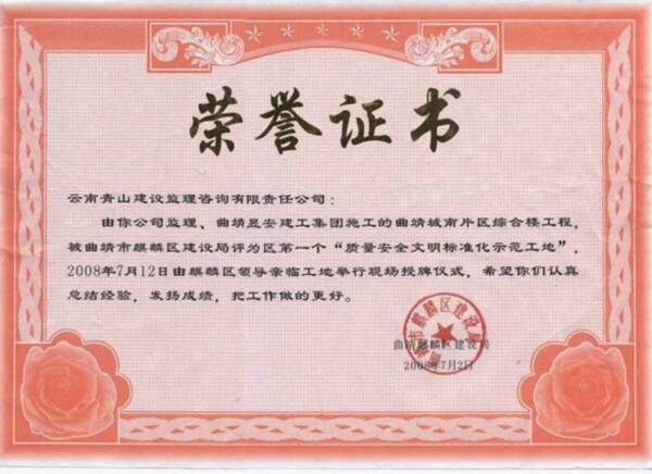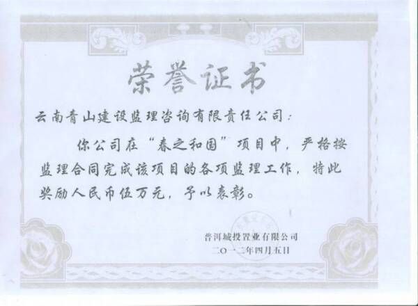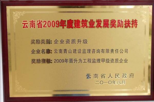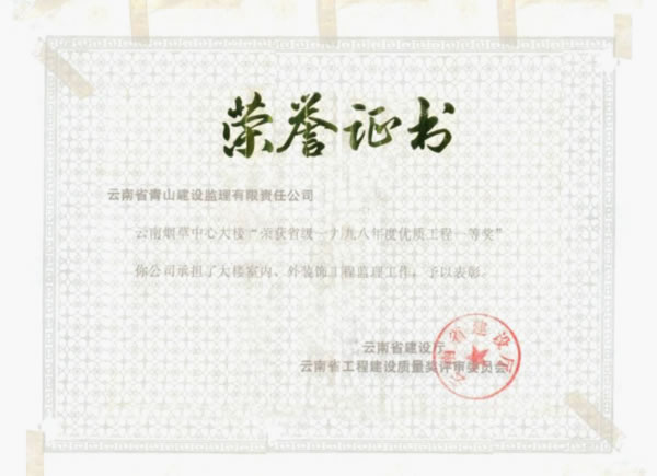 公司于2009年獲得云南市政府頒發(fā)的云南省建筑業(yè)發(fā)展“突出貢獻(xiàn)企業(yè)”。2009年獲得云南省建設(shè)監(jiān)理事業(yè)創(chuàng)新發(fā)展15周年“突出貢獻(xiàn)獎(jiǎng)”,2004年被建設(shè)部評(píng)為全國(guó)先進(jìn)工程監(jiān)理單位。2000年、2003年兩次被云南省建設(shè)廳評(píng)為云南省先進(jìn)工程建設(shè)監(jiān)理單位。 公司于2004年獲得建設(shè)部授予的全國(guó)先進(jìn)監(jiān)理企業(yè)稱(chēng)號(hào),2000年、2003年兩次被云南省建設(shè)廳授予云南省先進(jìn)工程建設(shè)監(jiān)理企業(yè),2009年8月榮獲云南省建設(shè)監(jiān)理協(xié)會(huì)授予的“云南省建設(shè)監(jiān)理事業(yè)創(chuàng)新發(fā)展15周年突出貢獻(xiàn)獎(jiǎng)”,2009年9月榮獲云南省人民政府授予的“云南省建筑業(yè)發(fā)展突出貢獻(xiàn)企業(yè)”獎(jiǎng)。