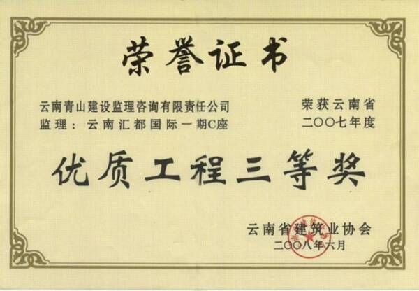 2007年優(yōu)質(zhì)工程三等獎(jiǎng)榮譽(yù)證書(shū)