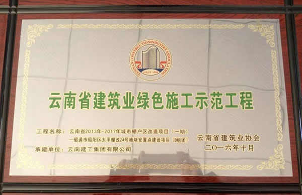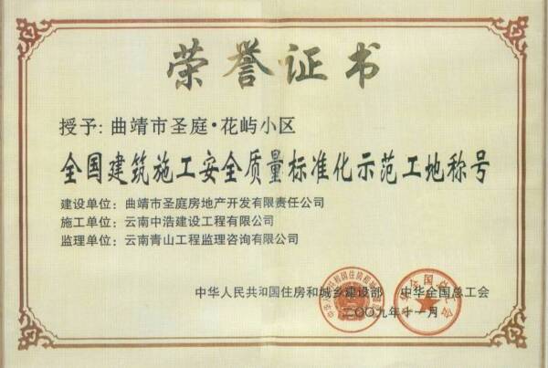 2009年曲靖項(xiàng)目獲得“全國(guó)建筑施工安全質(zhì)量標(biāo)準(zhǔn)化示范工地稱(chēng)號(hào)”
