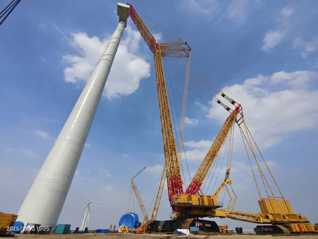 面對施工難題,項(xiàng)目團(tuán)隊(duì)創(chuàng)新采用樁基加固工藝增強(qiáng)地基穩(wěn)定性,啟用全球最大的4000噸級履帶式起重機(jī)——徐工XGC88000承擔(dān)吊裝任務(wù),通過“地面預(yù)調(diào)平+高空精準(zhǔn)協(xié)同”系統(tǒng)方案,最終實(shí)現(xiàn)重達(dá)千噸的機(jī)艙平穩(wěn)就位。