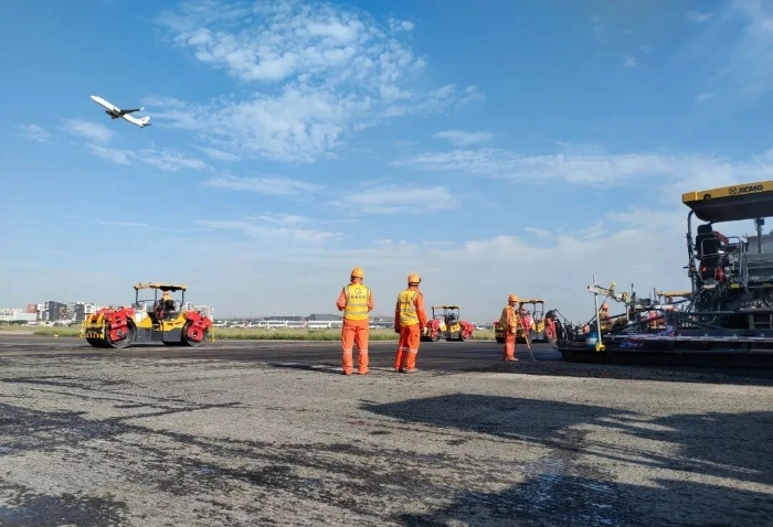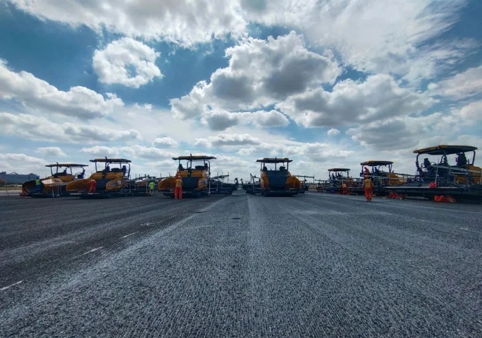 想象一下,航班在西跑道頻繁起降的同時,數(shù)百名施工人員和數(shù)百輛設備,就在幾百米外忙碌作業(yè)。施工挑戰(zhàn),前所未有的嚴峻。傳奇,在這短暫的15天一一上演。不過,這傳奇的紙簿上,亦被烙上“徐工金”的身影。徐工成套道路機械,在此項高難度施工中,迎難而上、挑起重擔。