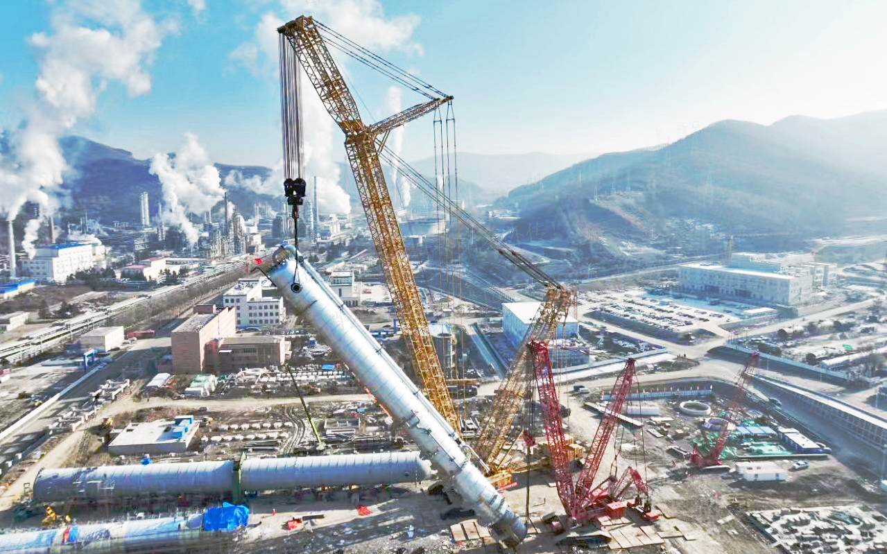 施工時(shí)刻,伴隨吊裝指令聲下達(dá),XGC88000搭配超起102+27m固定副臂,在1250噸吊車默契溜尾配合下,順利擎起千噸乙烯塔,并平穩(wěn)完成吊裝全過(guò)程,再度展現(xiàn)屬于吊裝施工的獨(dú)有魅力。