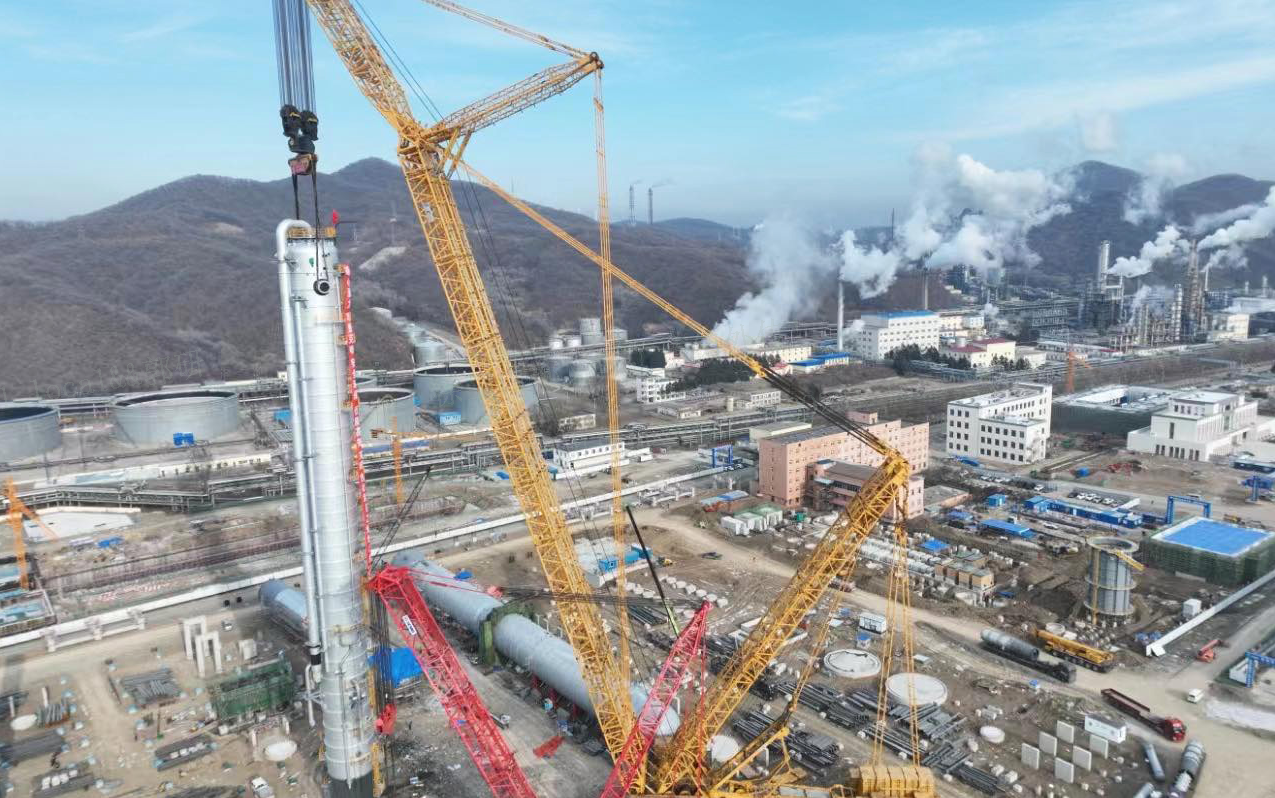 本次吊裝對(duì)象為直徑6.6米,高90.6米,總重1160.5噸的乙烯塔,是該項(xiàng)目年產(chǎn)120萬(wàn)噸乙烯裝置關(guān)鍵的5臺(tái)超限塔器之一。