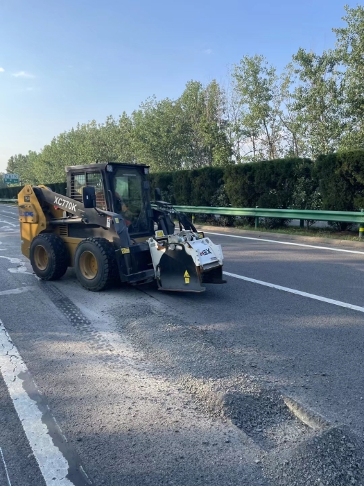 徐工滑移裝載機搭配銑刨器高速公路坑槽病害快速銑刨,預留臺階,便于分層壓實和提升路基結(jié)構(gòu)穩(wěn)定。