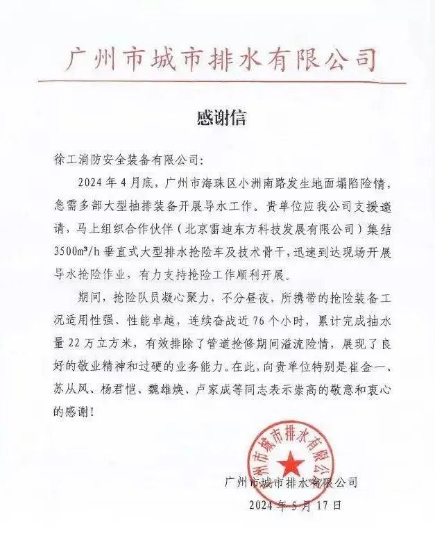 近日,徐工消防收到一封來自廣州市城市排水有限公司的感謝信,信中熱忱感謝徐工在廣州市海珠區(qū)某地地面坍塌險(xiǎn)情中提供的高效、專業(yè)的設(shè)備及人員支持。