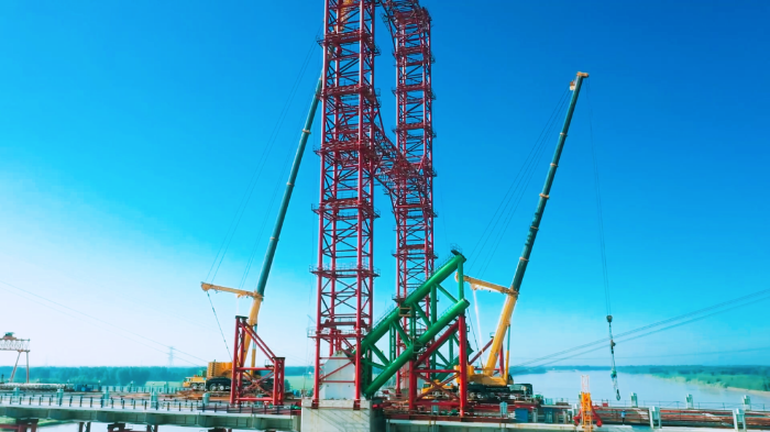 該黃河特大橋是目前國(guó)內(nèi)規(guī)模最大的下承式鋼管混凝土系桿拱橋,作為架起拱橋主拱圈“骨架”——拱肋的主力,徐工起重機(jī)是如何架起“彩虹”的呢?