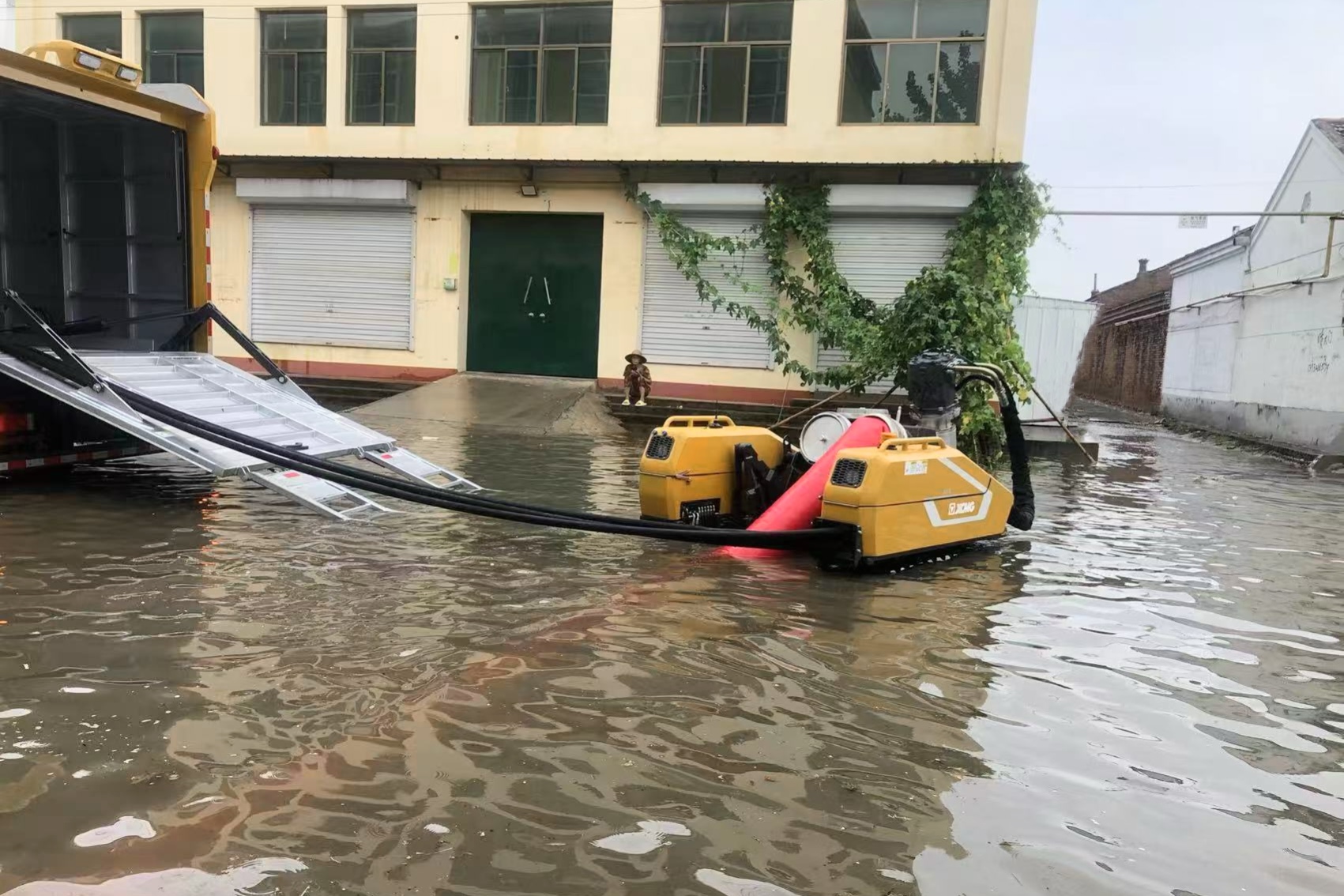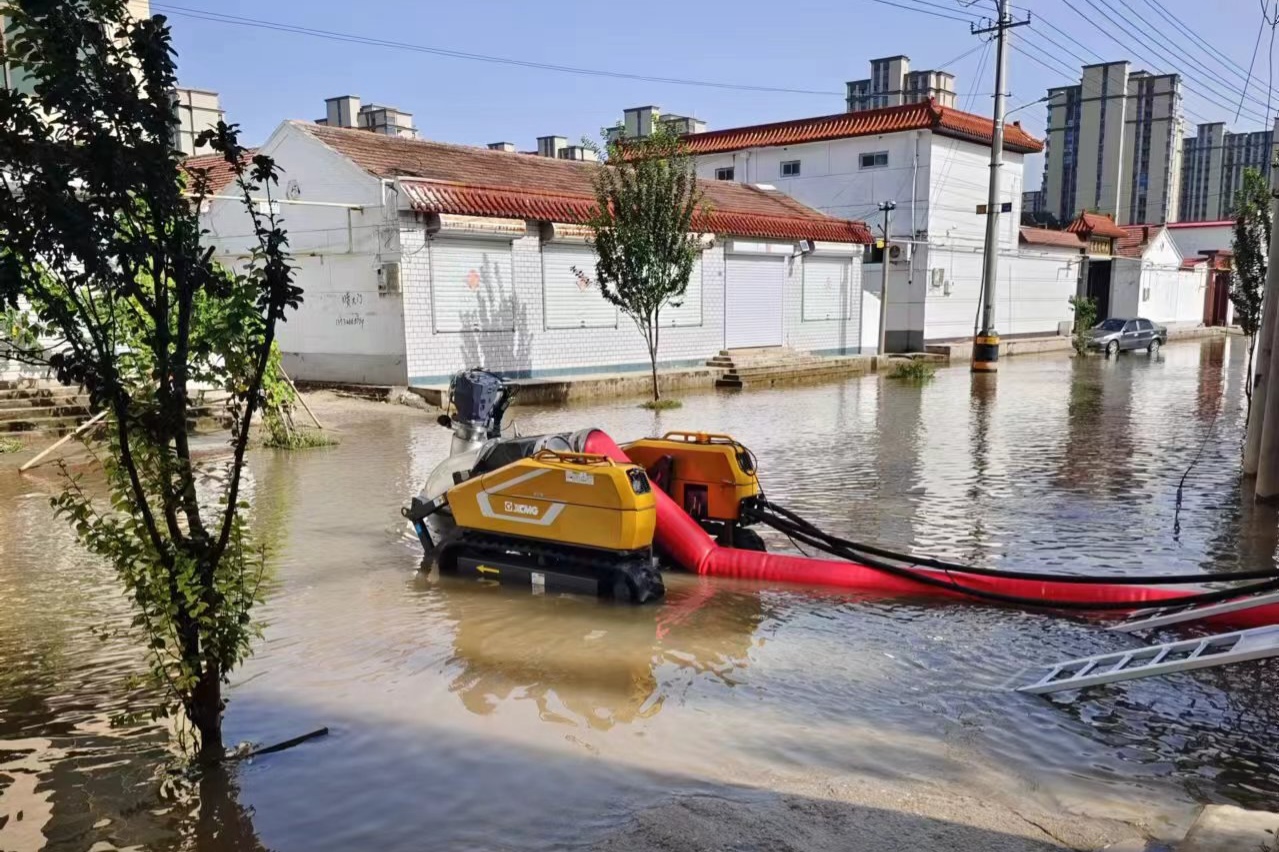 首日,車輛到達(dá)現(xiàn)場(chǎng)后,徐工救援人員立即針對(duì)現(xiàn)場(chǎng)環(huán)境制定排水方案。由于場(chǎng)地狹窄,大型救援車輛轉(zhuǎn)彎調(diào)頭不便,最終救援人員決定充分發(fā)揮“子母式排澇車”子車探入作業(yè)與履帶底盤小半徑轉(zhuǎn)彎優(yōu)勢(shì),將母車停至路口,遙控子車帶著120米水帶“穿街走巷 靈活走位”,將積水源源不斷排入下水道。連續(xù)作業(yè)6小時(shí)后,PS30F4累計(jì)排水超14000立方,因雨勢(shì)逐漸增大,第一天救援被迫中止。