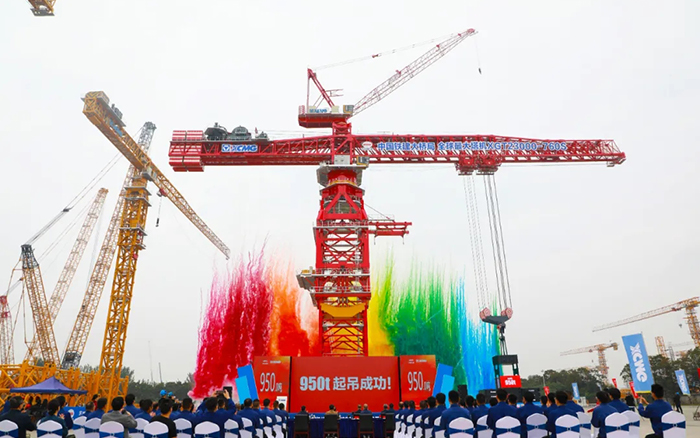 儀式現(xiàn)場,全球最大塔機(jī)XGT23000-760S順利完成1.25倍動載起吊,吊裝重量達(dá)到950噸。