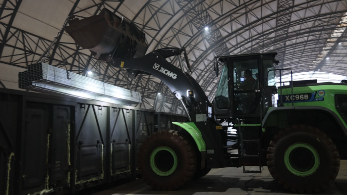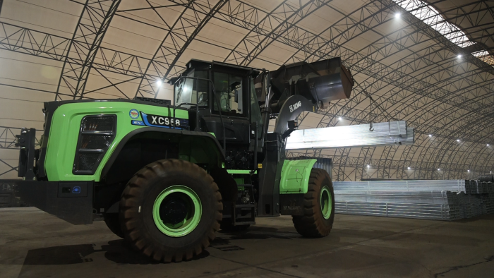 貨運(yùn)站臺上,一臺綠甲戰(zhàn)士格外引人注目,這臺徐工XC968-EV純電動裝載機(jī)不同以往的圓弧型大臂像極了武俠小說中的“圓月彎刀”,格外引人注目。