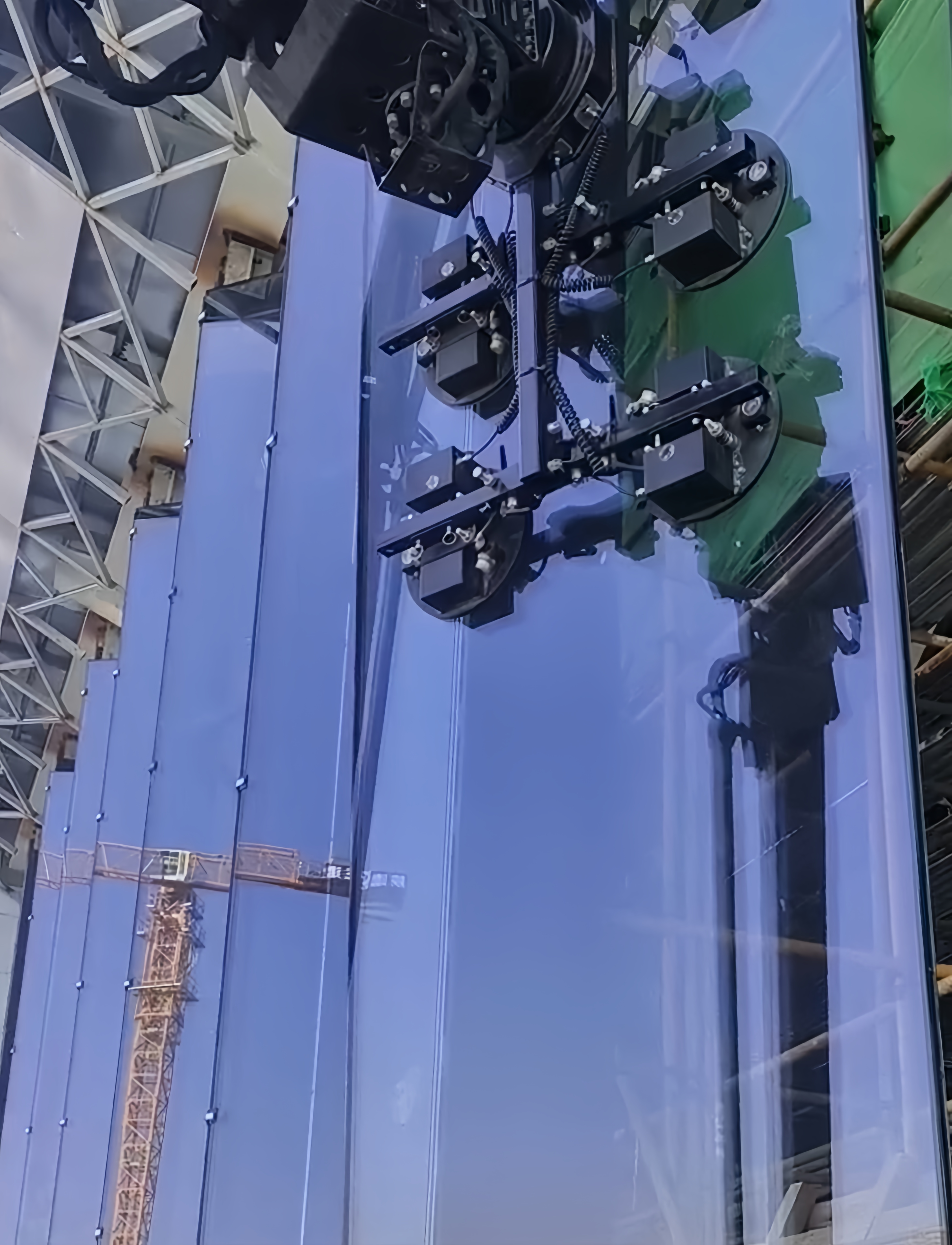 這是在西安大秦文化館玻璃幕墻安裝現(xiàn)場極其平常的一個場景,西安當(dāng)?shù)貙I差異化設(shè)備的知名租賃商,在承接超大尺寸+超大重量的玻璃安裝時,摒棄了傳統(tǒng)依賴大量的人工,輔以吊車吊裝、吊機(jī)等工具抬高作業(yè)的情況,也避免了因受力不均或碰撞,造成玻璃損壞帶來的高昂損失,保障了施工人員安全。