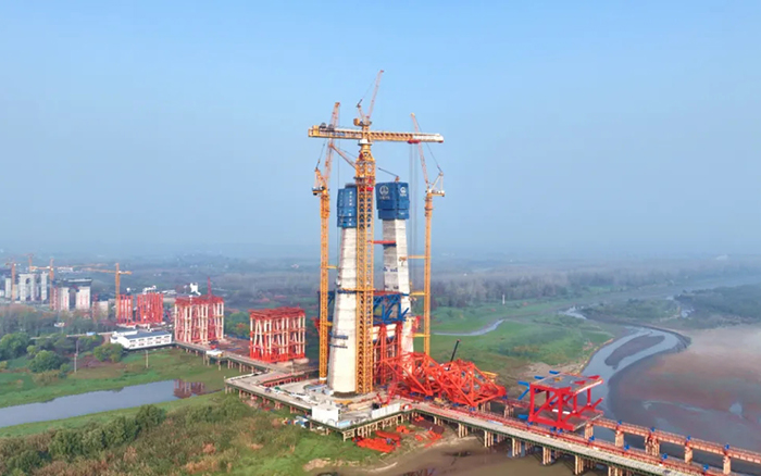 巢馬鐵路馬鞍山長江大橋是世界最大跨度三塔斜拉橋,主塔總高345m。采用XGT15000-600S塔機進行上部鋼塔柱施工吊裝僅需將鋼塔柱劃分為13個吊裝單元,最大單元重量超550t,較傳統(tǒng)施工方式效率提升65%以上。