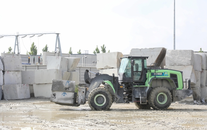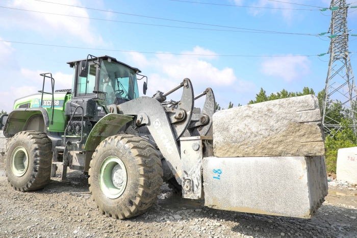 華中腹地,某大型石材加工內(nèi),全球首臺徐工XC968EV-T20純電動石材叉裝機(jī)在原石堆放區(qū)輾轉(zhuǎn)騰挪,高效完成著原石卸貨,整理碼放及轉(zhuǎn)運(yùn)上料等工序。連續(xù)不斷的電機(jī)蜂鳴聲,演奏著建設(shè)綠色未來的樂章。