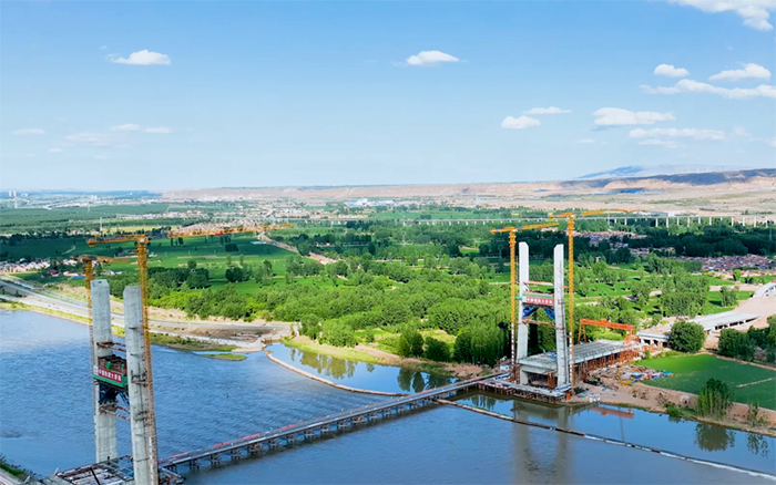 中衛(wèi)下河沿黃河公路大橋全長1228米,主塔高113米,相當于40層樓高,是目前寧夏單跨跨徑最長、樁基最深、樁徑最粗、承臺混凝土量最大、主塔最高的斜拉橋,單體施工體量為寧夏橋梁建設史上之最。