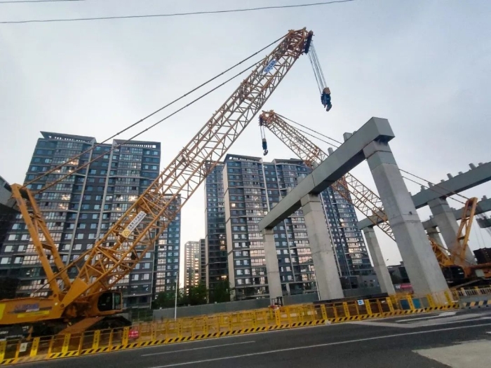 狹窄空間內(nèi),兩機(jī)協(xié)同微調(diào),在進(jìn)行精確轉(zhuǎn)場移動的同時,也避免了任何晃動或扭轉(zhuǎn),重物分毫不差地平穩(wěn)落位至預(yù)定橋墩支座上,整個過程高效流暢,一氣呵成。