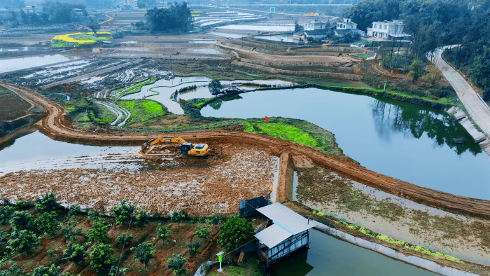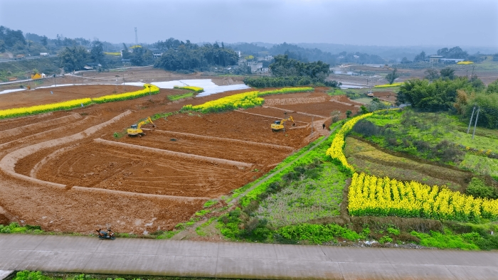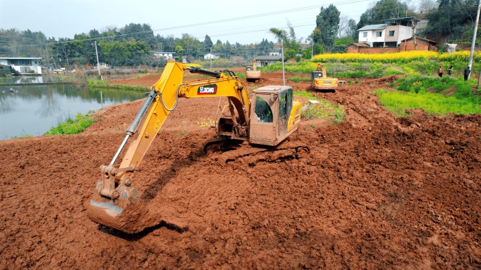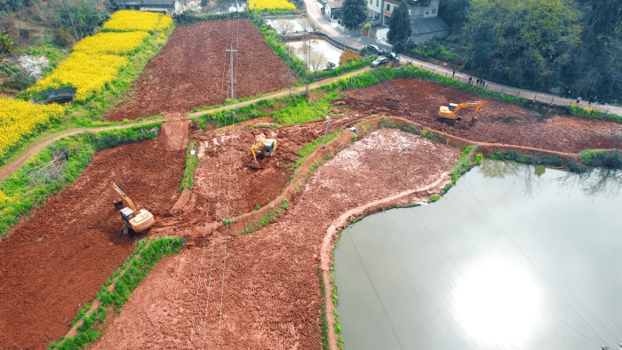 繼續(xù)向東,這里是萬里長(zhǎng)江第一城——宜賓,在宜賓江安縣陽春鎮(zhèn),5000畝高標(biāo)準(zhǔn)農(nóng)田建設(shè)進(jìn)入尾聲,項(xiàng)目高峰期投入30余臺(tái)徐工挖掘機(jī)。