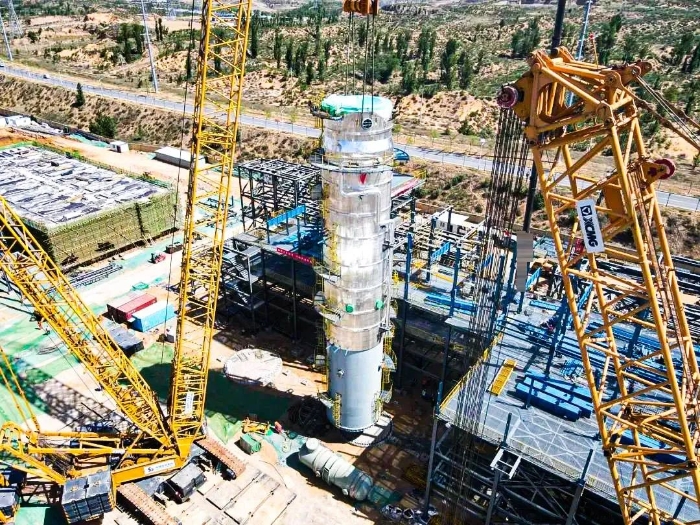 近日,在某大型多晶硅產業(yè)升級項目現(xiàn)場,徐工QUY450(450噸級)履帶起重機攜手XGC12000(800噸級)履帶起重機精密協(xié)同,成功完成項目首臺大型精餾塔吊裝任務。