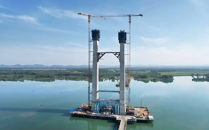大橋主塔采用“H”型造型結構,總高度201米,XGT360-20S1、XGT7528A-18S1屹立在大橋兩側肩負主要吊裝工作,滿勤作業(yè)、高效運轉,保障高空對接安全,雙塔協(xié)力頻頻突破重要建設節(jié)點。